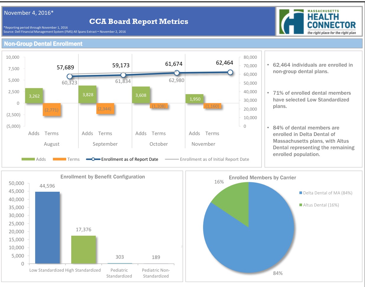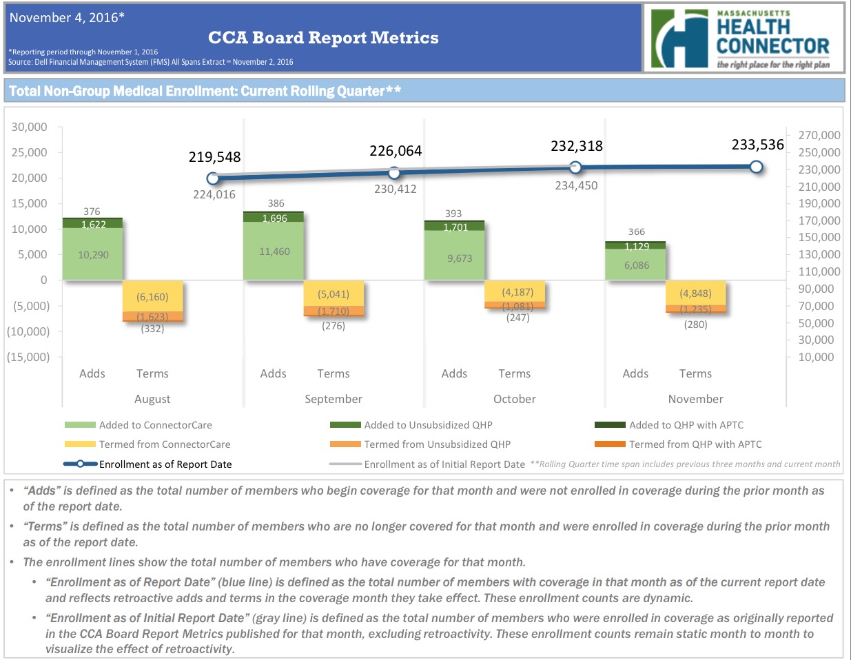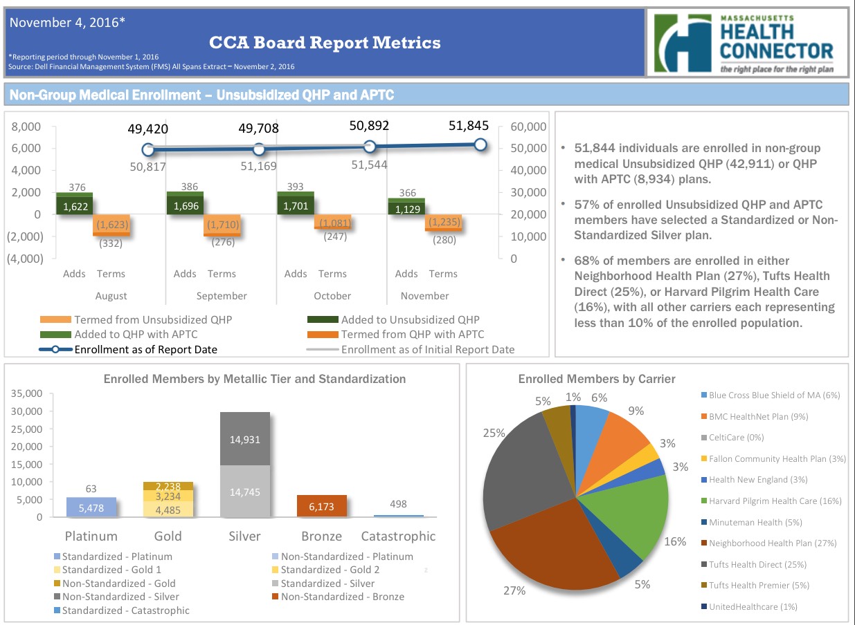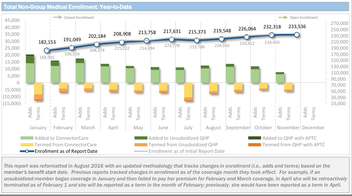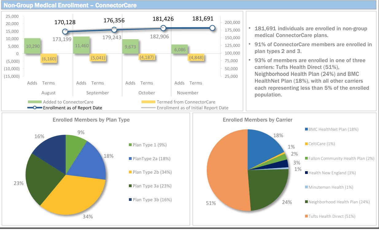 According to the dashboard report, as of November 2nd, the MA Health Connector had 233,536 people enrolled in effectuated policies, or 12.8% more than they had at the end of March.