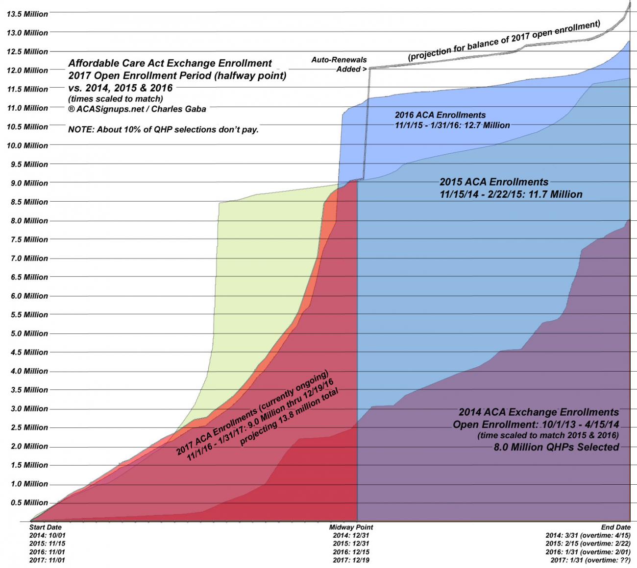 The 2017 open enrollment period, currently underway, is the first time that the start/end dates have matched up two years in a row, which is why they overlap so closely. It may appear that this year's enrollments have fallen behind last year, but that's only because the HC.gov auto-renewals will be added to the total about a week later than they were last year. Once those are baked in, I expect the grand total to shoot back over the top, ending somewhere in the 13.5 - 14.0 million range. Assuming no overtime period is tacked onto the end of January (which seems likely, given that we'll be into Trump/GOP control territory by then), this will cover a total of 92 days.