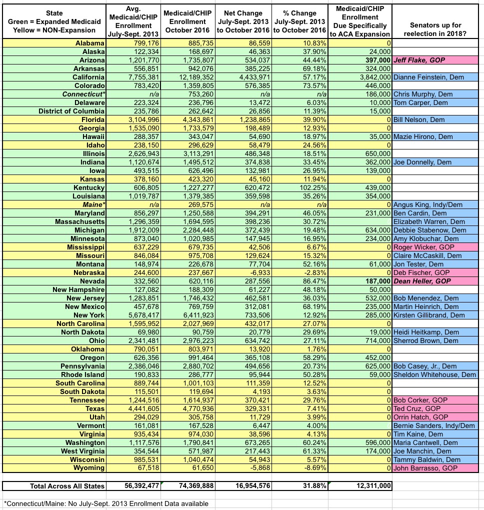 I've also listed which U.S. Senators are up for re-election in each state in 2018. As you can see, Republicans Jeff Flake (Arizona) and Dean Heller (Nevada) will be under tremendous pressure not to repeal the Affordable Care Act; nearly 6% of Arizona's entire population and 7% of Nevada's are enrolled in Medicaid specifically due to the ACA.