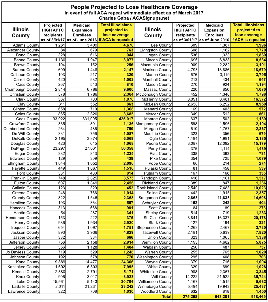 Illinois is pretty straightforward. Assuming 400,000 people enroll in exchange policies by the end of January (a modest 3% increase over last year), I estimate around 275,000 of them would be forced off of their private policy upon an immediate-effect full ACA repeal, plus the 643,000 enrolled in Medicaid expansion as of June 2016, for a total of just over 918,000 Illinoisians kicked to the curb.