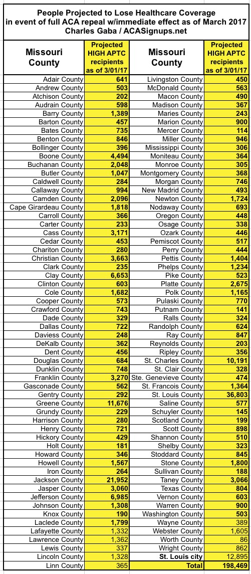 In the case of Missouri, assuming 283,000 people enroll in exchange policies by the end of January, I estimate around 198,000 of them would be forced off of their policy upon an immediate-effect full ACA repeal.