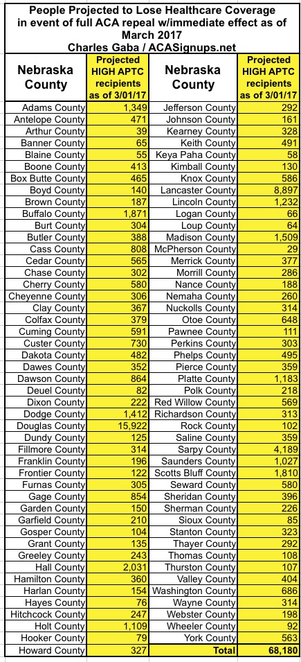 In the case of Nebraska, assuming 96,000 people enroll in exchange policies by the end of January, I estimate around 68,000 of them would be forced off of their policy upon an immediate-effect full ACA repeal.