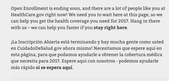 UPDATE 5:00pm: I've been checking HC.gov now and again all day, and sure enough, it's been bringing up the "Waiting Room" message pretty consistently ever since around 2pm. Note that according to Aisling McDonough, a communications rep. at CMS, the actual deadline is Midnight Pacific time, which is 3:00am Eastern time.