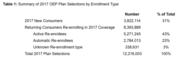Well, 8.4 million 2016 enrollees ended up renewing/re-enrolling. This is actually very close to what I originally projected back in mid-October (8.5 million), but 700K lower than HHS was expecting (9.2 million). Unfortunately, only 3.8 million new enrollees signed up this year...well below both HHS and my expectations (4.6 million and 5.2 million respectively).