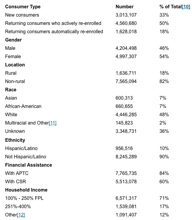 • 3.3 million enrollees are 18-34 years old, or 27% of the total. This is down slightly from the 28% of Young Invincibles that we've seen in past years, likely due to the Trump Administration's last-minute Ad-Kill stunt in the final 5 days of Open Enrollment.