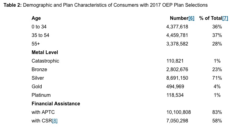 83% of enrollees are receiving APTC (federal tax credits), which is pretty much the same as prior years. Over 7 million people are receiving CSR assistance, which would be wiped out under the Trumpcare plan.