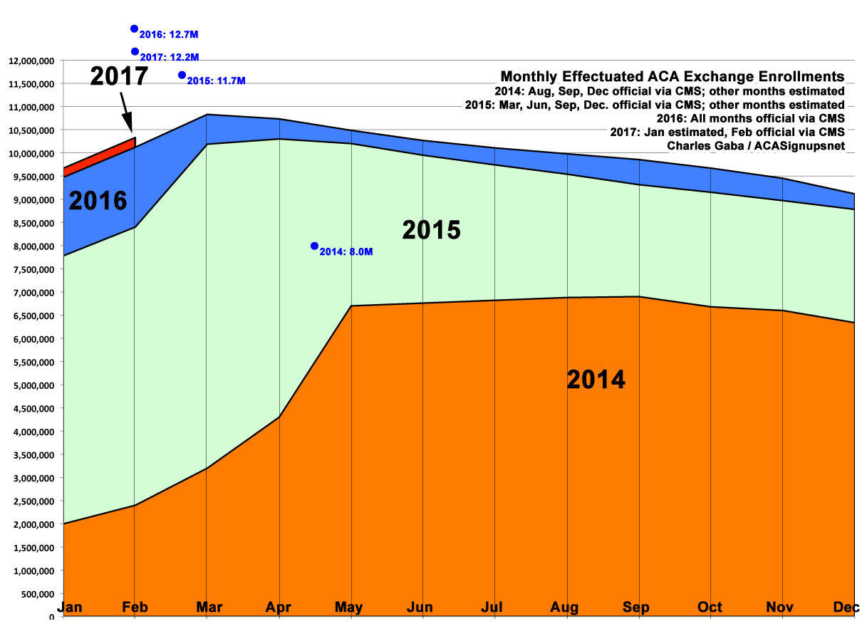 For 2017, of course, we only have 2 months of data so far...but it appears to be starting out slightly better than last year even though the total number of QHP selections was half a million lower. I may have to adjust this as further data/clarification comes in from CMS in the future, but my guess is that when all the March effectuation data is added in, it'll peak at roughly 10.9 million for March, then slide down throughout the year, ending at roughly 9.2 million in December. The monthly average will likely be something like 10.1 million people.