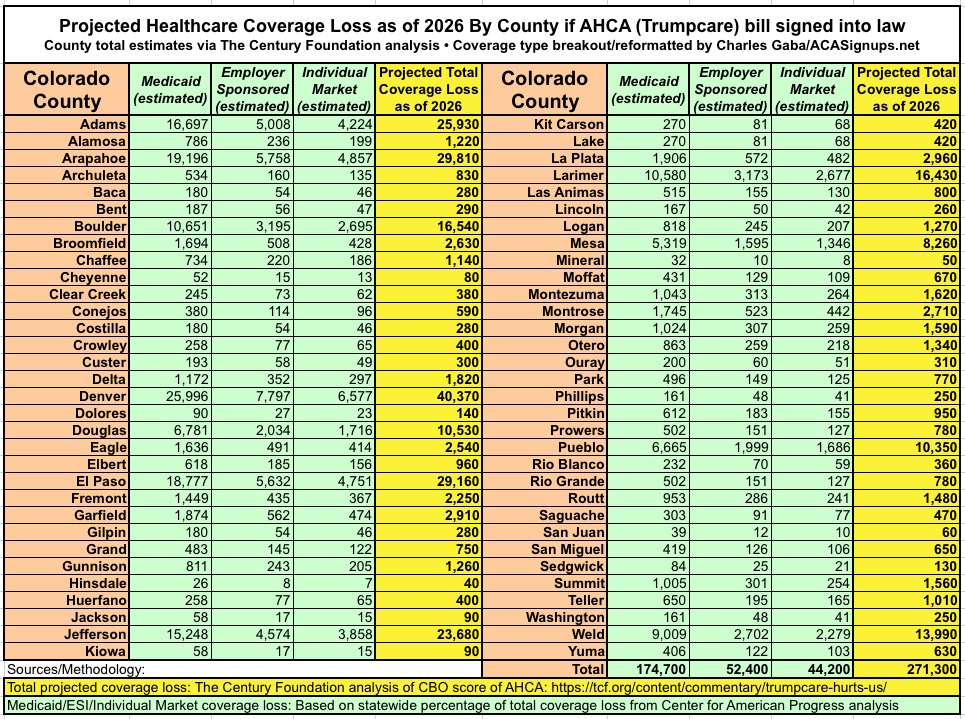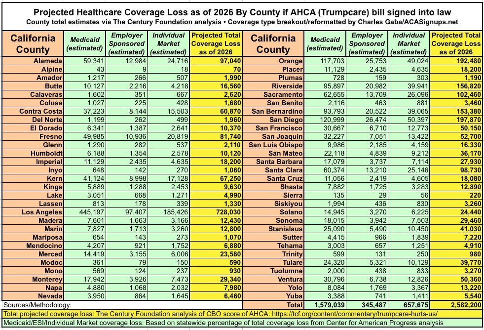 With that in mind, here's the County Level breakout of the Century Foundation's projections of how many people would lose healthcare coverage by 2026 under the GOP's AHCA bill. The yellow columns (Total) come directly from TCF's analysis; the green columns (type of coverage loss) are my own proportional estimates within those totals.