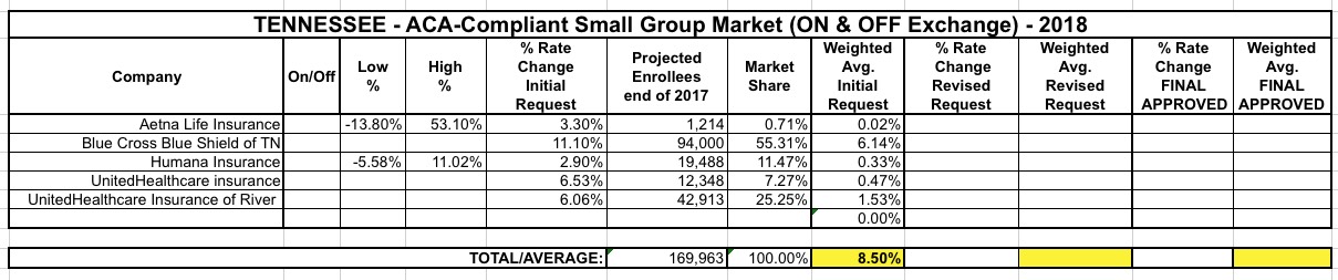 To my knowledge, there are actually 6 individual market carriers in Tennessee this year: Aetna, TRH (Tennessee Rural Health), Blue Cross Blue Shield, Cigna, Humana and "Freedom Life" (which, again, is basically a phantom carrier with no enrollees). Aetna and Humana are out, so that leaves TRH, BCBSTN and Cigna. TRH doesn't appear to have submitted an official 2018 rate filing as of yet, but they only had 3,500 enrollees this time last year anyway, so likely won't have much impact on the overall weighted average rate hikes.