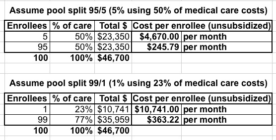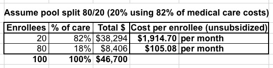 Let's say that you have 100 people currently using an average of $467/month in healthcare services (for the moment, I'm ignoring profit margins and the like). That's a total of $46,700 per month for all 100 people.