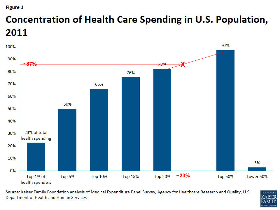 This is admittedly crude, but based on Kaiser's bar graph above, I'm pretty sure 23% of the risk pool uses roughly 87% of medical expenses, like so: