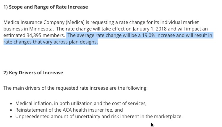 For 2017, unsubsidized enrollees on the Minnesota individual market faced massive rate hikes averaging 57%. It was so bad that the only way they could convince some carriers to participate in the market was to allow most of them to put a cap on how many people they'd enroll (with the balance being shunted over to Blue Plus, the HMO division of BCBSMN). This resulted in a massive initial surge of enrollment, as it was on a first-come, first-serve basis...but also left off-exchange and unsubsidized exchange enrollees high and dry.