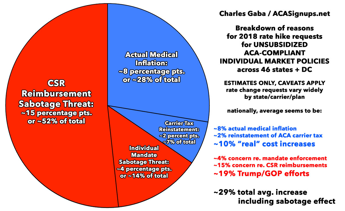 Overall, to the best of my judtgment, the national picture looks very close to the following: Roughly 19 percentage points, or around 2/3 of the total, is due to either the CSR Payment or Mandate Enforcement factors, with the remaining 10 points (around 1/3 of the total) due to actual increased cost of medical services (including prescription medications), as well as the reinstatement of the ACA's carrier tax: