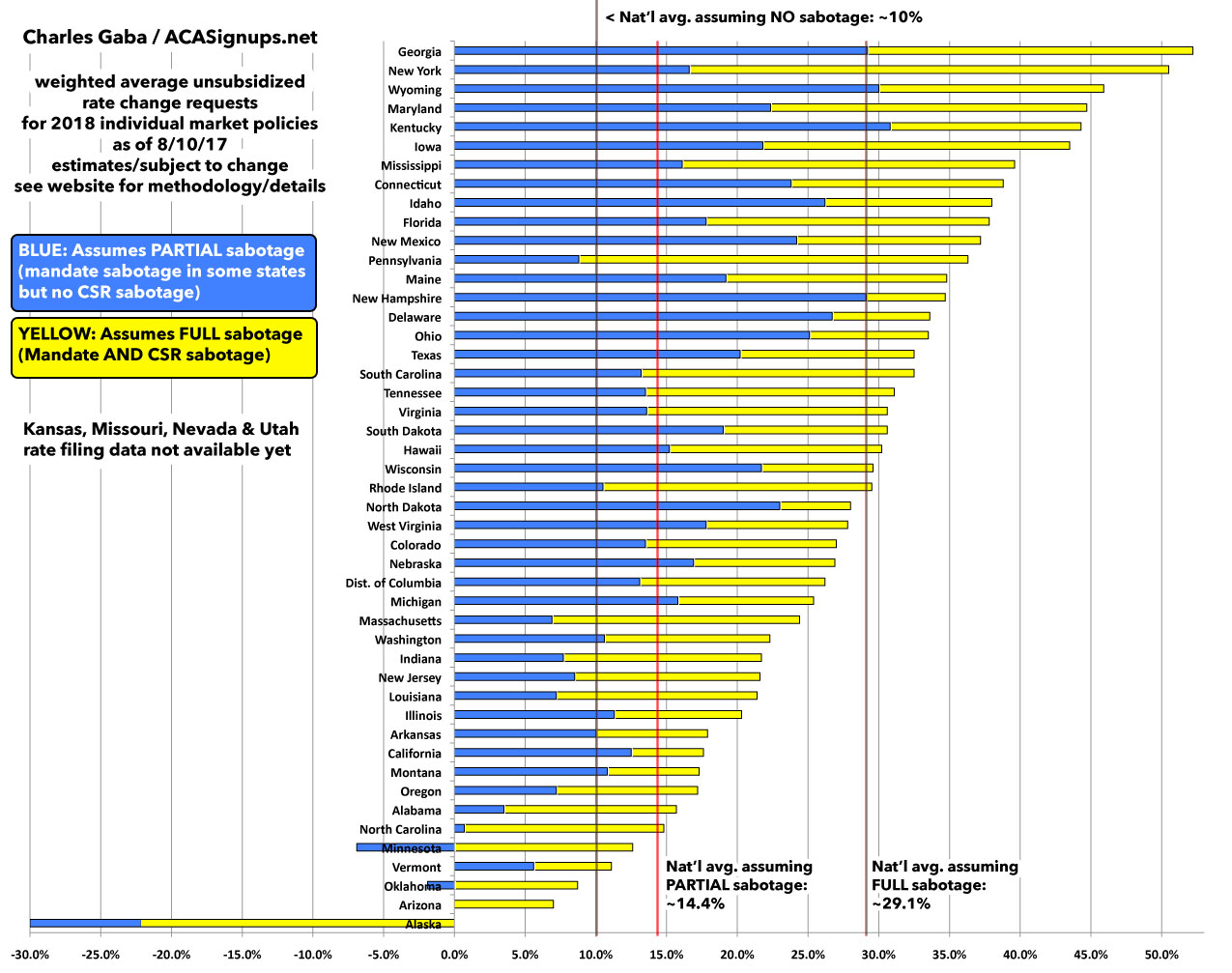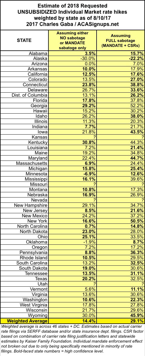 Yes, that's right: Overall, nationally, carriers are asking for around a 29% average rate hike assuming CSR payments aren't guaranteed for 2018 and the individual mandate penalty isn't enforced...or around 14% assuming that CSR payments are guaranteed. As noted above, it's more difficult to separate out the individual mandate threat because most of the filing justification letters either don't mention it at all or only refer to it in vague terms ("increased morbidity expected due to changes in federal policy", etc.)...but there are some major carriers which have indeed specifically called it out and even attached a hard number to the impact.