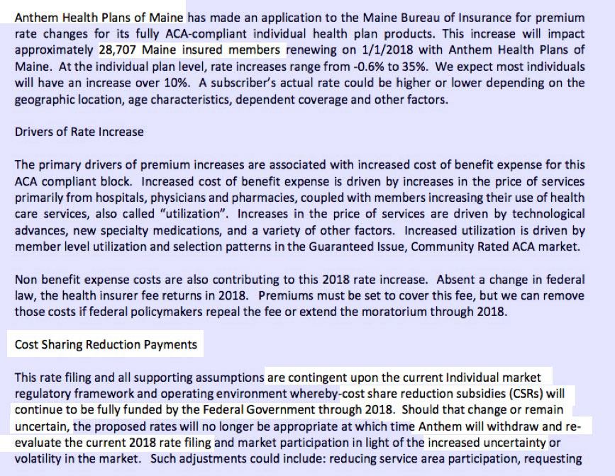 The bad news is that it's actually more complicated than that due to the Trump/GOP Sabotage Factor. As you can see in the filings below, Anthem's 21.2% hike assumes CSR payments will continue, which means their CSR #TrumpTax increase would be an additional 16%, according to the Kaiser Family Foundation, or 37.2% total.