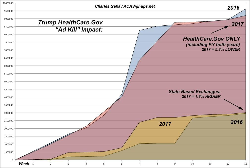 If the 5.3% drop was consistent across every state I'd say you might be right...but look at the performance of the 12 state-based exchanges...which have their own branding, marketing campaigns and advertising budgets. In those states, 2017 enrollment increased by 1.8% year over year...and that doesn't even account for the fact that New York's Basic Health Plan program, which ramped up bigtime this year, effectively cannibalized several hundred thousand potential exchange enrollees. If you include BHP enrollees in NY and Minnesota, the state exchanges saw a net increase of 10.6% over last year. Alternately, if you disregard New York altogether, the other 11 states saw a net increase of 3%.