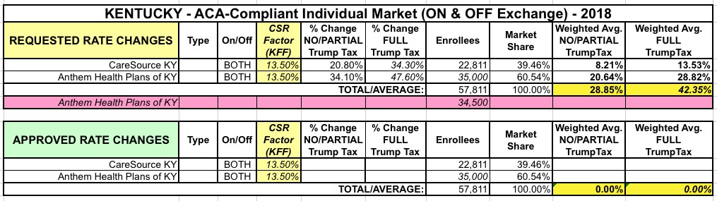 I'm not sure how many current enrollees this will impact. Anthem has around 70,000 indy market enrollees in Kentucky; assuming that's proportional statewide, that would mean roughly 35,000 people who will have to switch over to CareSource (thankfully, unlike in Virginia, Anthem's move doesn't open up any more "bare" counties). If so, that changes Kentucky's Requested Rate Hike summary to look something like this: