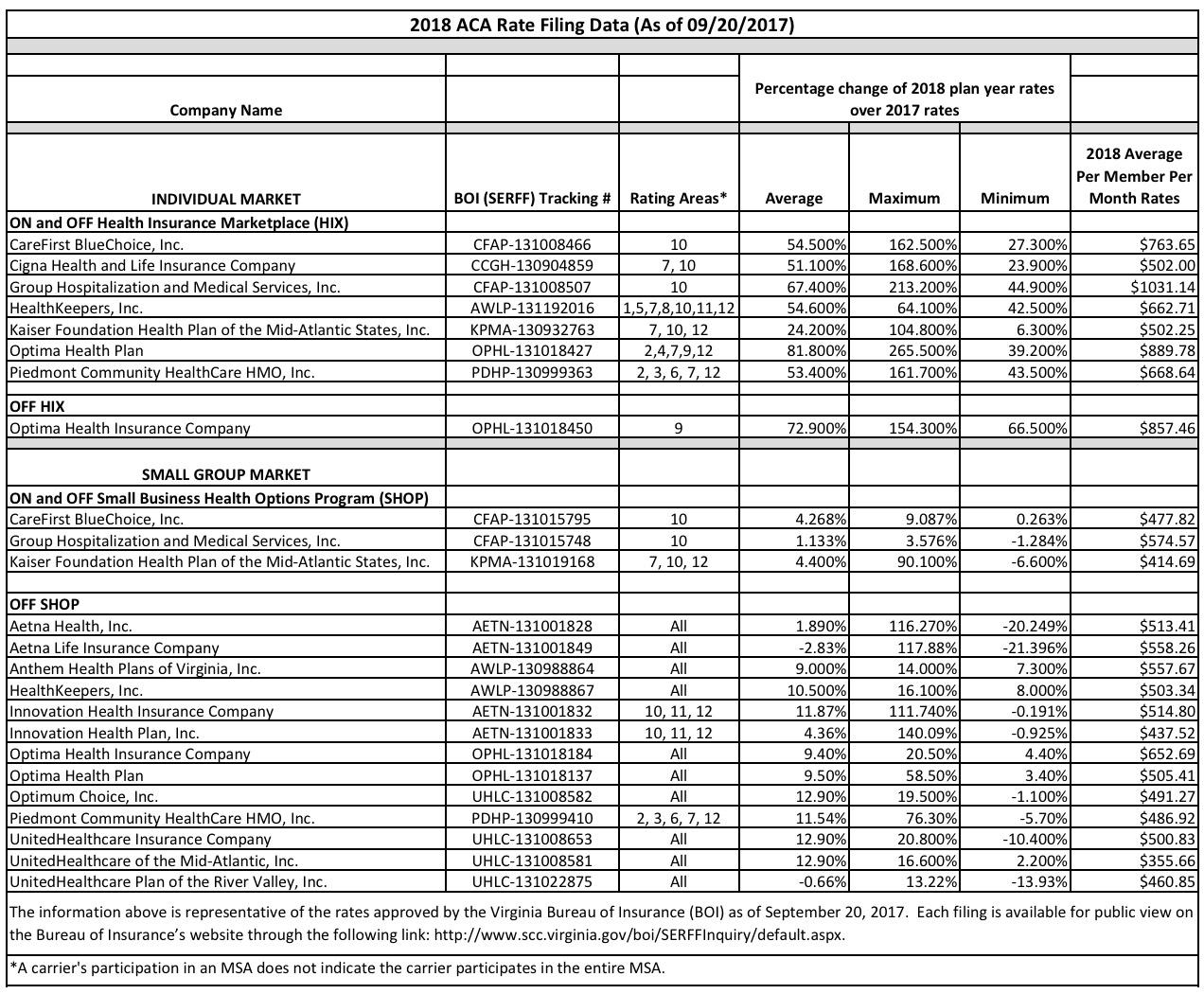 As many see their options for health plans dwindle down to one insurer, premiums are simultaneously set to rise by an average of 57.7 percent next year in Virginia’s individual marketplace.