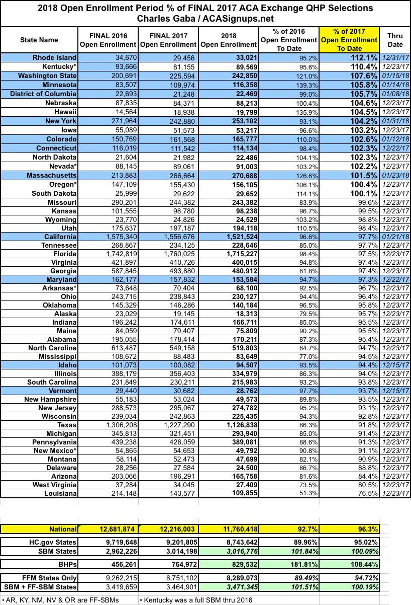 But there's still more: There are 5 states which are hosted by HealthCare.Gov (Arkansas, Kentucky, Nevada, New Mexico and Oregon) but which are still operated as State-Based Marketplaces. That is, they utilize HC.gov as their technical enrollment platform...but they still have control over their own budgets, ad/marketing/ outreach programs, negotiations with the insurance carriers in their states and so forth. These are referred to as "Federally-faciitated State-based Marketplaces" or FF-SBMs. Three of these (Kentucky, Nevada and Oregon) also beat last year's numbers...and Kentucky in particular blew 2017's numbers away by over 10% (second only to Rhode Island in year over year improvement).