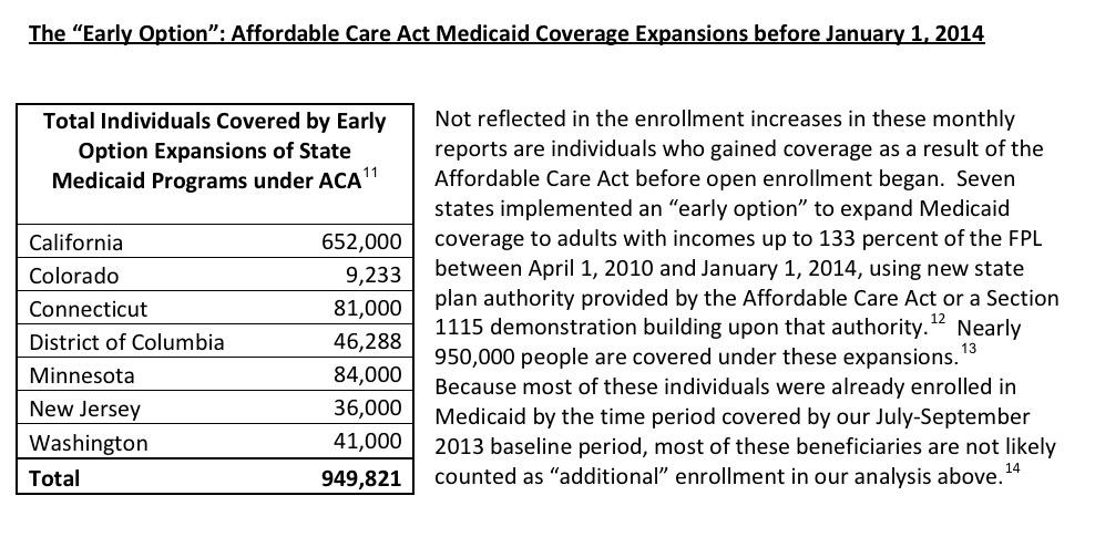 It's also important to note that while the monthly reports do always compare current Medicaid/CHIP enrollment against the third quarter of 2013 (just before ACA expansion officially went into effect), there were another 950,000 or so people who had already been enrolled in Medicaid via the ACA's early expansion option across 6 states and the District of Columbia. There's always a reference to this in the monthly reports, but it was broken out clearly on Page 5 of the March 2014 CMS Medicaid Enrollment report (thanks to Emma Sandoe for the link!):