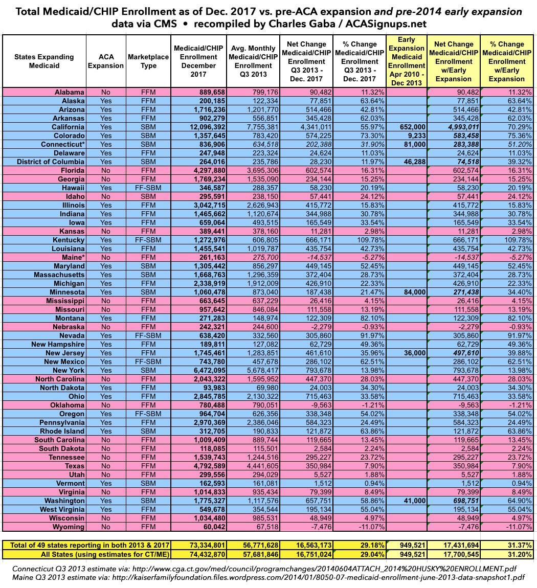 December 2017 Medicaid/CHIP Report is out; enrollment up ~17.5M vs pre-ACA