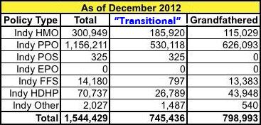 Just to be sure, I also went ahead and plugged in the December 2012 numbers, and sure apparently there was already a quiet shift towards ACA-compliant plans even then: 1.54 million total individual market enrollees, with 745K ACA compliant "transitional" and 799K in grandfathered plans: