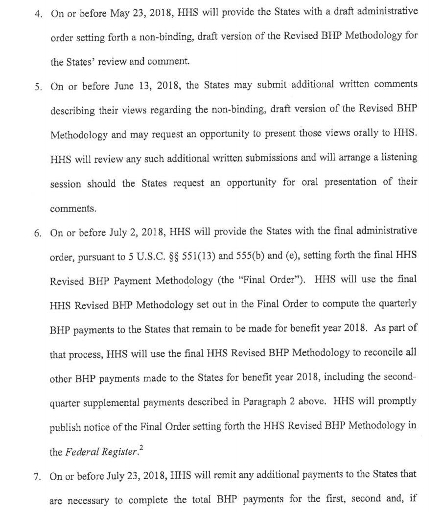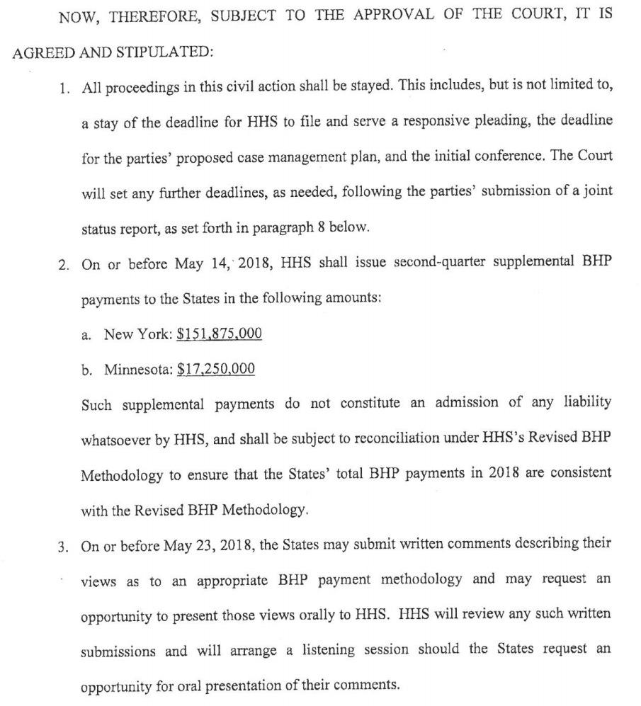 I've posted the relevant text below, but the gist of it seems to be that the HHS Dept. has to pay at least $169 million to NY and MN to cover the 2nd quarter of 2018, and that MN/NY/HHS are required to put their heads together and come up with some alternate method for HHS to use to come up with the money they owe the states going forward. It also sounds like HHS will have to pay NY/MN the rest of the money owed for the 1st and possibly 3rd quarters of 2018 as well if the new formula doesn't cover them.