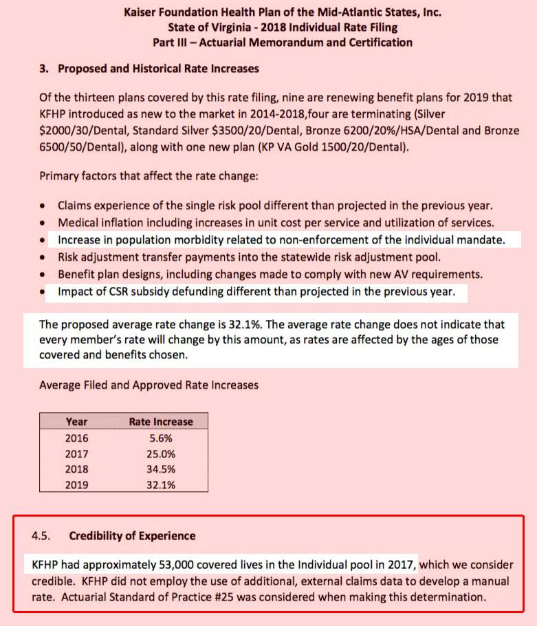 As for what portion of the requested rate hikes are due specifically to sabotage actions (mainly the elimination of the individual mandate and expansion of short-term/association plans), that's a bit less clear so far. The carriers do call out these factors (see screen shots below), but most aren't pinning a hard number. The CBO is projecting a ballpark 10% hike due specifically to the mandate repeal, and at least one VA carrier says this is about right: