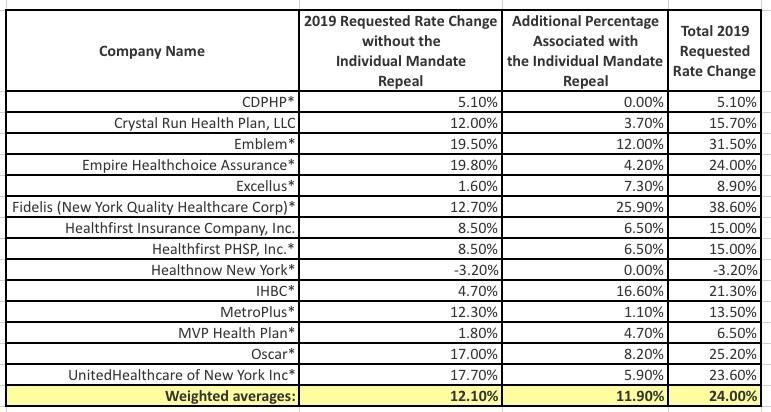 Yes, the NY DFS has actually done pretty much all the work for me...not only are they putting a hard number on the portion of next year's rate increases caused by the mandate being repealed at the statewide level, they even did so on a carrier-by-carrier basis: