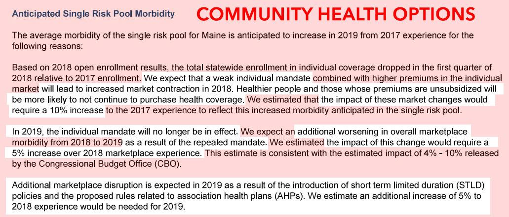The other two carriers don't give any hard numbers on the mandate/#ShortAssPlans factors, but assuming they're also around 10 points apiece, that means if you remove the mandate/shortassplan sabotage factor, Maine would likely be lowering 2019 premiums by either 0.4% - 3.8%.