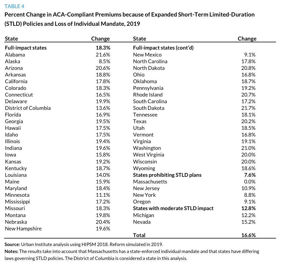 Unfortunately, in many states, neither the insurance department nor the carriers provide any hard guidance on this (in some cases one small carrier out of 5-6 might do so, not enough to extrapolate from). In those cases, I've turned to the most comprehensive analysis of the issue I know of: The Urban Institute's study on The Potential Impact of Short-Term Limited-Duration Policies on Insurance Coverage, Premiums, and Federal Spending from back in March. Here's their bottom line: