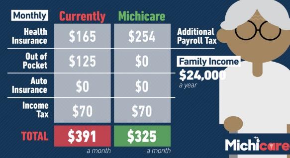 "The average Michigan family (two parents and their child, making Michigan’s average salary of $48,432 a year) will save almost $5,000 a year between insurance, out-of-pocket health costs, and auto insurance under Michicare. Under Michicare, a patient’s health insurance will also be comprehensive, portable, and permanent. That means Michiganders will have continuous coverage even when they change jobs. "