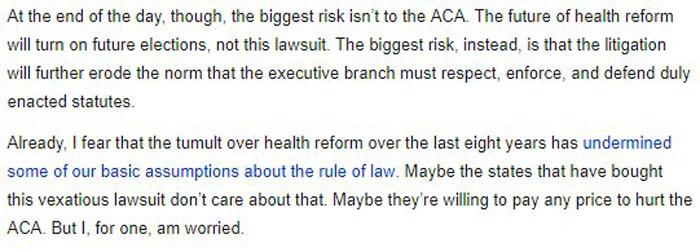 - It dislikes the law, and can muster the stupidest of fig-leaf arguments to claim that its essential elements should be invalidated. If this stands as a precedent, the rule of law will mean one thing in a Republican administration and a different one in a Dem administration.