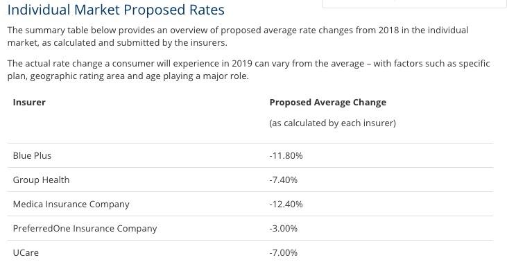 Well this is a nice surprise! Yesterday the Minnesota ACA exchange, MNsure, issued a press release a day ahead of the public posting of requested 2019 individual market insurance rate changes, advising people of the various ways they have to keep their premiums down via ACA tax credits, shopping around and so forth. I was immediately concerned that they might know something I didn't...perhaps they were expecting a batch of double-digit rate hikes as has happened in so many other states the past few years?