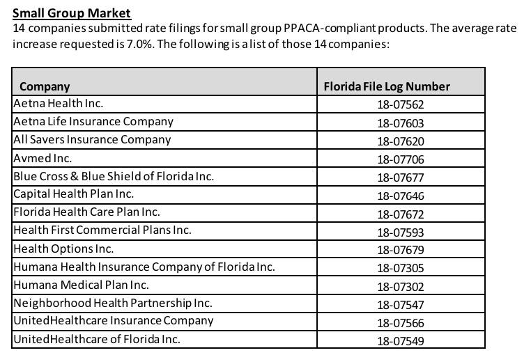 With that in mind, the Florida Dept. of Insurance has released a document with the top-line numbers for the 2019 ACA individual and small group markets. It's pretty skimpy on the details, providing only the carriers participating (9 on the individual market, 14 on the small group market), the fact that 7 of the 9 individual market carriers will be both on & off-exchange (the other two will be off-exchange only), and the average 2019 rate increases being requested: 8.8% for the individual market, 7.0% for the small group market.