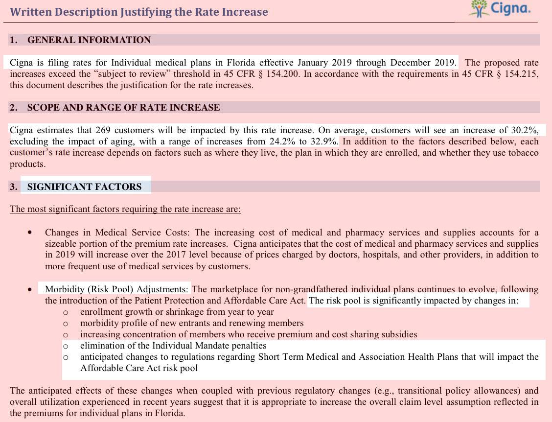 UPDATE: The folks over at Protect Our Care have managed to get ahold of one of the 2019 Rate Filings, for Cigna Health & Life Co. Cigna is asking for a whopping 30.2% average unsubsidized rate increase next year, ranging from 24 - 33%. Granted, Cigna also only has 269 enrollees, which explains why the weighted statewide average is "only" 8.8%, but otherwise their filing is pretty clear about what's to blame for a large chunk of it: