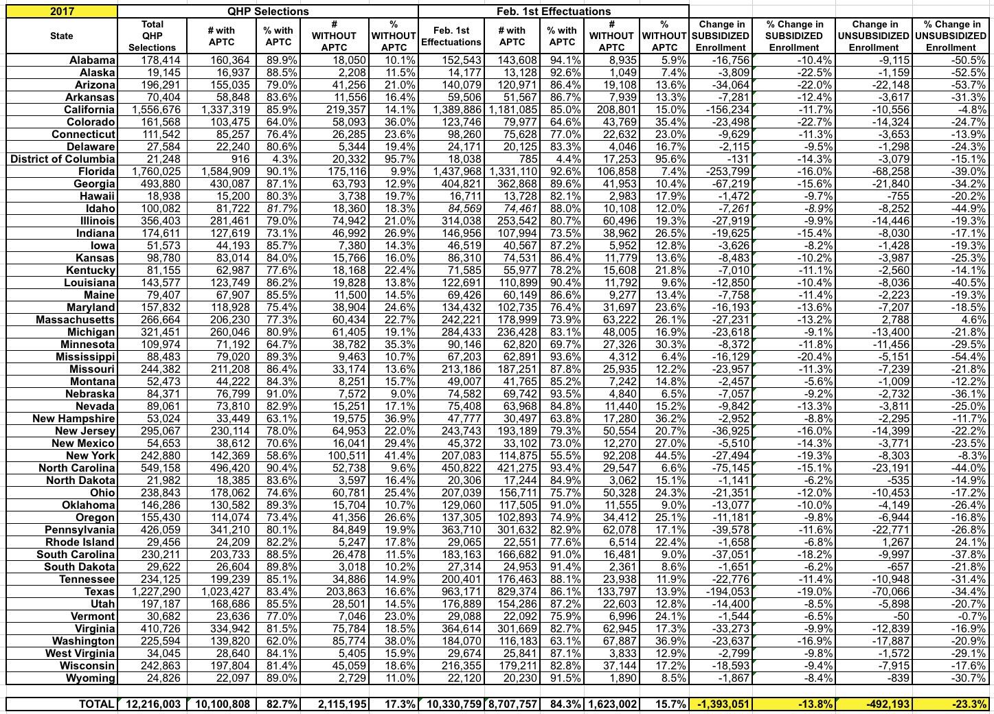 In prior years, CMS used the end of Q1 (March) as their "as of" effecuation report cut-off date. The March effectuation number was 85-87% of the total QHP number for 2015, 2016 and 2017...but there was some "churn noise" mixed in with all of that, since some people drop their coverage after the first or second month while a good 8,000 or so other folks sign up every day during the off season via Special Enrollment Periods.