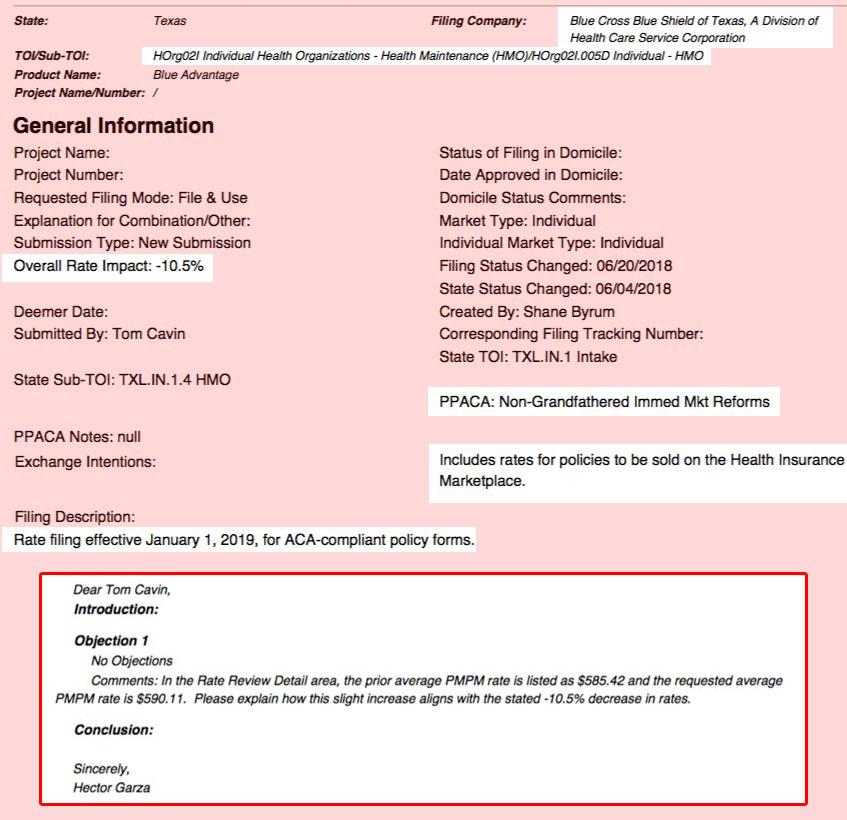Also note the last screenshot below which shows a partial filing from Blue Cross Blue Shield of TX which claims that they're dropping premiums by 10.5%...but the filing contradicts itself, with an included response letter asking why they're showing a 10.5% drop but also stating that their average expected premium will be increasing by 0.1%. Until this discrepancy is cleared up, I can't plug BCBSTX into the spreadsheet.