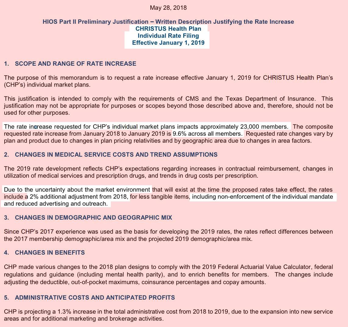 I'd also need to see the additional documentation to understand how on earth BCBSTX could have overestimated their 2018 rate increases by so much--they requested nearly a 24% increase this year, but were only approved for 20.4%.