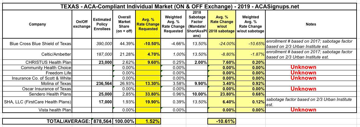 UPDATE: Texas: Preliminary 2019 #ACA rate hike request: 1.5% INCREASE vs. ~10.6% DECREASE w/out sabotage