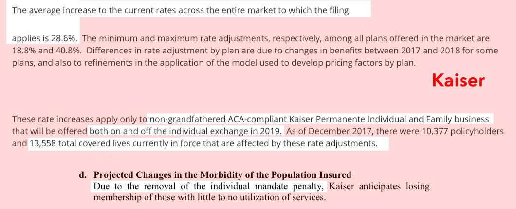 Both filings mention repeal of the Individual Mandate Penalty as a major factor in their rate hikes, but neither gives a specific breakout. The Urban Institute projected a 17.5% impact from mandate repeal and the expansion of short-term plans combined, but Hawaii has taken action to head STPs off at the pass, so I'm knocking 2 points off of that estimate. In addition, as usual, I'm further knocking 1/3 off of Urban's projections in the interest of caution.
