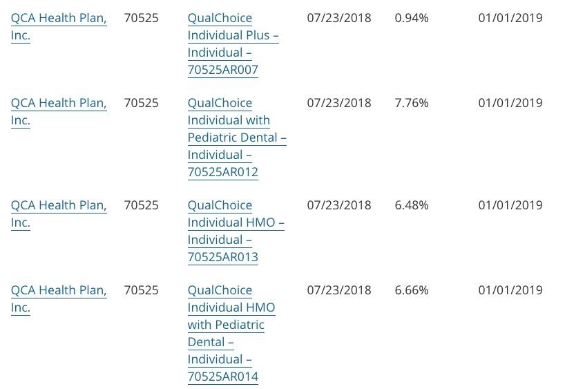 Arkansas has three carriers offering ACA individual market policies, but one of them is kind of/sort of split into two separate entities (QualChoice and QCA). Unfortunately, most of the key actuarial memo content has been redacted, so I'm missing data on market share for three of the four entries--Ambetter/Celtic is the only one which states outright their current enrollment number. For the other three I had to estimate based on last years data. For QCA and USAble (which is actually Blue Cross Blue Shield, for some reason), I had to sort of split the difference between the different entries to get the overall requested rate increases.