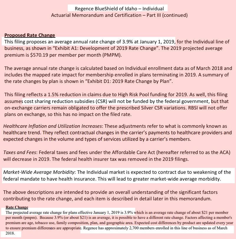 Idaho's insurance department website displays their annual rate filing summaries in a unique way--they don't publish the actual enrollment numbers, but they do post breakouts of the rate hikes for different metal levels (handy!) as well as the premiums brought in and claims paid out, which gives some refreshing insight into just how profitable (or not) some fo the carriers are (if I'm reading the screenshot correctly, it looks to me like BCBS and Mountain Health did just fine last year, but the other three carriers ended up in the hole (especially SelectHealth...ouch).