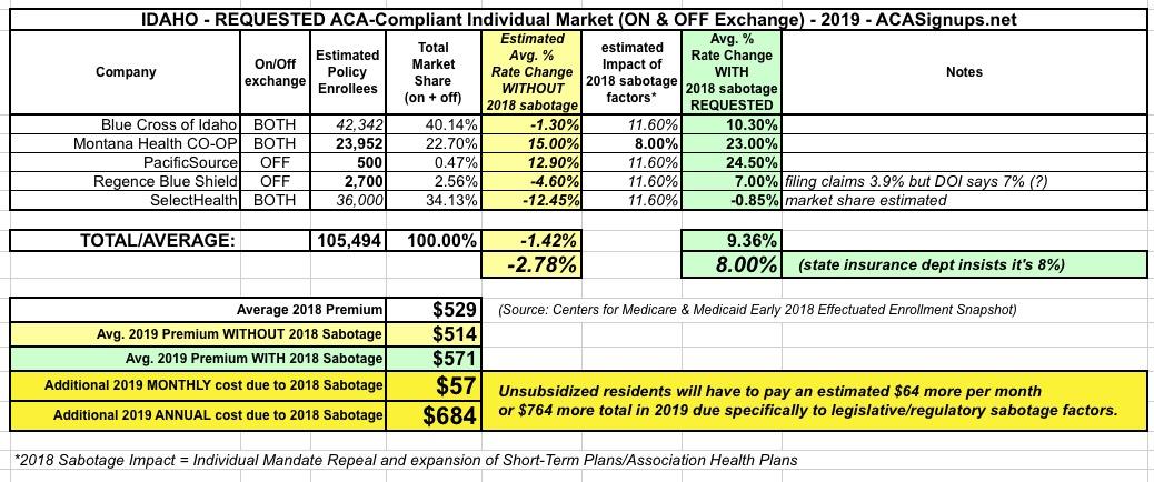 Average 2018 ACA premiums are $529/month in Idaho, so that's a $57/month difference, or around $684 more per unsubsidized enrollee.