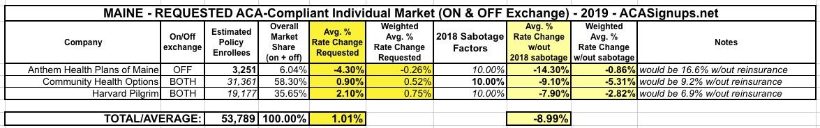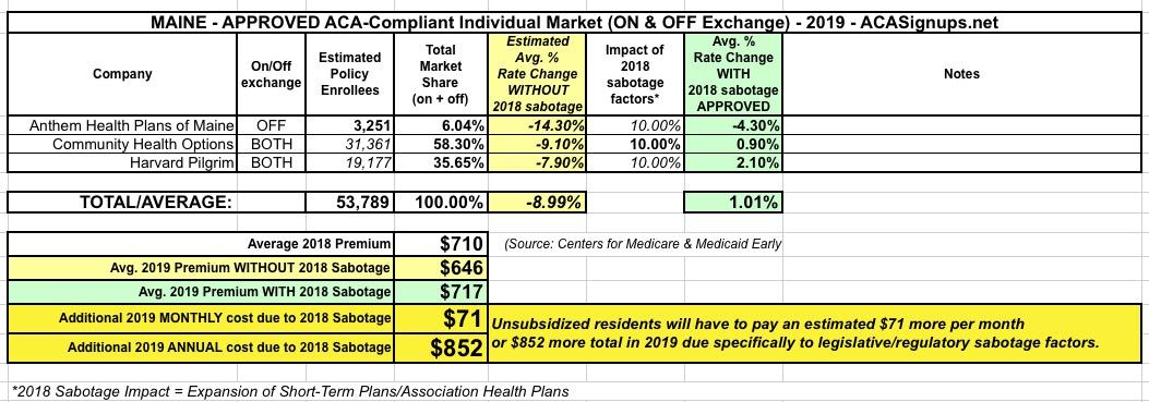 UPDATED: Maine: Thanks to reinsurance, 2019 rates only increasing 1.0%...but they WOULD likely be DROPPING by ~9.0% w/out sabotage