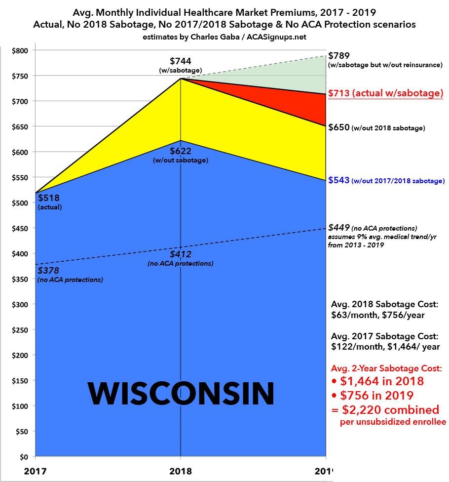 - and finally, just for the hell of it, my best estimate of what Wisconsin individual market premiums would look like in 2019 if the ACA had never been passed. While the dollar amount is significantly lower (around $449/month for most enrollees), keep in mind that there'd also be no financial assistance for low-income enrollees, no protections for people with pre-existing conditions, no requirement to cover essential health benefits, no caps on out-of-pocket expenses, and annual or lifetime claim ceilings would still be in place.