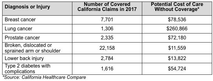 In 2017, Covered California consumers were protected from a wide variety of medical claims: More than 11,000 were diagnosed with either breast, lung or prostate cancer; 22,000 consumers fractured, dislocated or sprained their arm or shoulder; nearly 3,000 suffered a lower back injury and 1,600 were diagnosed with Type 2 diabetes with complications.