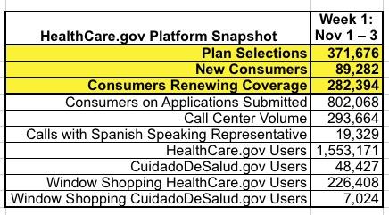 "Weeks" are measured from Sunday - Saturday regardless of what day November 1st falls on, thus the partial week being tallied. Last year, HealthCare.Gov enrolled over 601,462 people in the first four days of Open Enrollment, with 464,140 current enrollees manually renewing their policies and 137,322 new enrollees signing up. How about this year? Here's the official report from CMS: