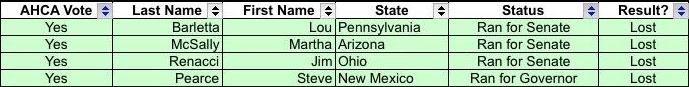 In all, at least 57 of those who voted "yes" on the AHCA have since lost their jobs in public office one way or another in the past year and a half, or at least 26% of the total. This number could climb as high as 63, though it'll likely top off at around 60.