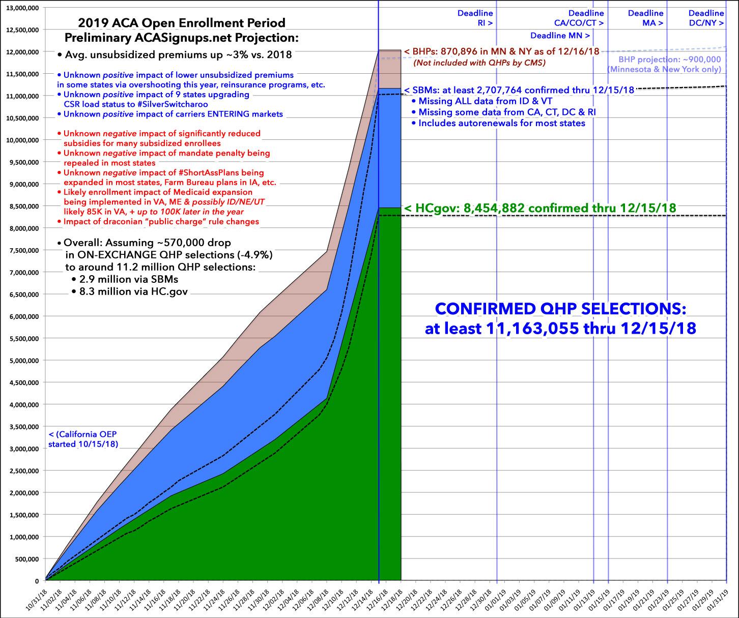 OK, with the big Week 7 HC.gov Report having been released, I can now fill in most of the blanks for the 2019 Open Enrollment Period: A grand total of 11.16 million QHP selections nationally so far. That includes 8.45 million on the federal exchange, plus another 2.7 million on the 12 state-based exchanges. If the counting were to stop right here, the total would be almost exactly 5% lower than last year, which would actually be pretty good all things considered.